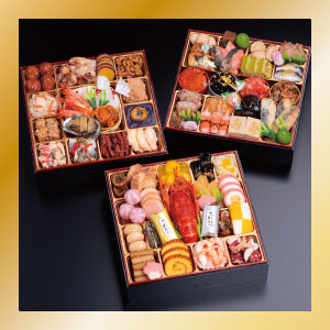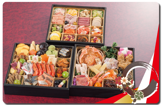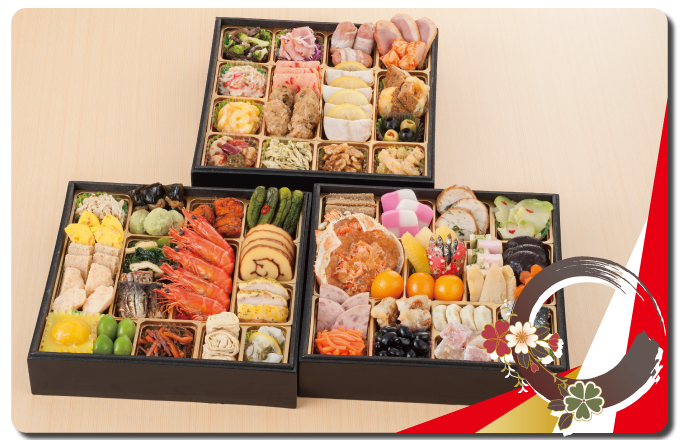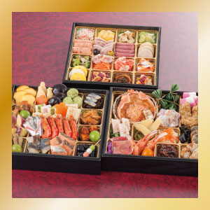 【参の重】柚子鶏つくね・鶏の三色巻・こんにゃく旨煮・紅鮭白醤油焼・若桃甘露煮・湯葉旨煮・新緑ふくさ・長寿貝の中華風・ままかり酢漬け柚子風味・紅白結び餅・紅白なます・いくら醤油漬・金箔黒豆・紅鮭の石狩漬・松前漬・チーズインミート・牛肉ごぼう時雨煮・柚子くらげ・海老紅白奉書・椎茸旨煮・寿高野豆腐・鰆西京焼・柚子オーロラ